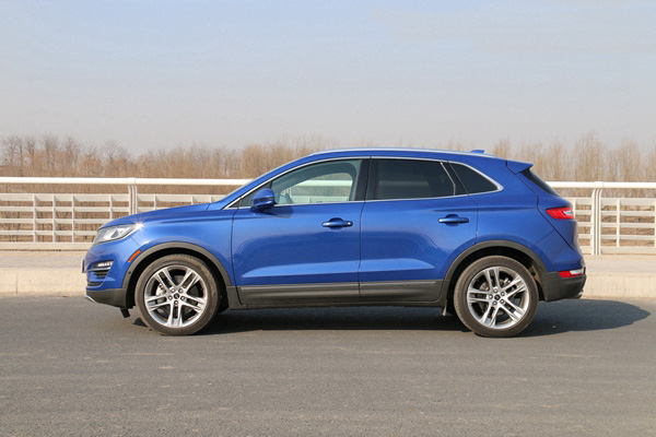 車輛側面,基于翼虎平臺打造而來的林肯MKC并沒有采用翼虎那樣年輕的線條設計,而是采用了貫通式高腰線的設計,主要以流暢感為主,用波瀾不驚來形容是最為合適的。車身尺寸長寬搞為4552/1863/1641mm,軸距為2690mm。