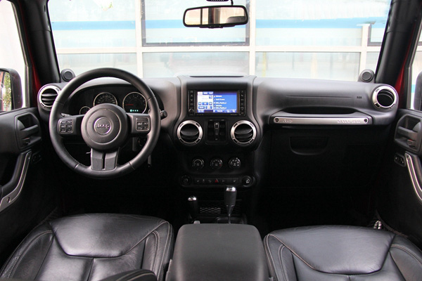 牧馬人的內飾設計非常簡單,沒有多余的按鍵與過多的電子設備,多功能方向盤手感舒適,可以控制行車電腦,定速巡航等。儀表盤采用兩大兩小四個圓組合儀表,簡單直觀。