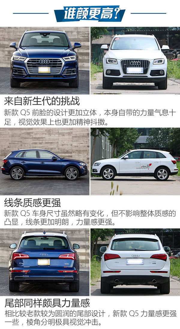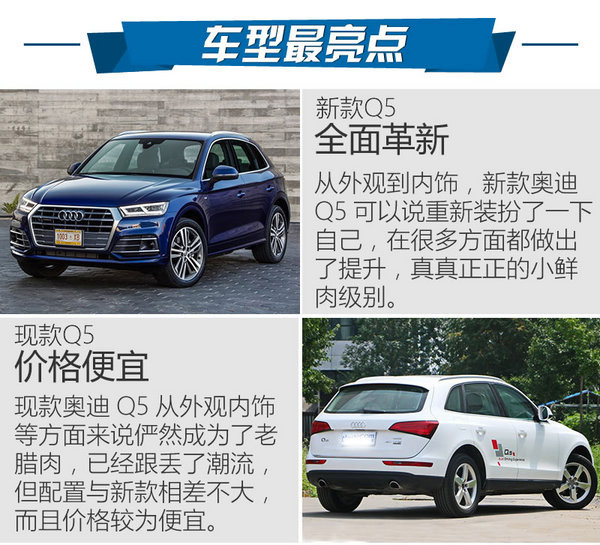 總結(jié):年輕人總是喜歡追逐更美、更時(shí)尚的東西,新款Q5也絕對(duì)能夠滿足你的這些虛榮心,因?yàn)樗_實(shí)夠靚,但不要認(rèn)為它只是花架子,在內(nèi)飾設(shè)計(jì)、科技配置、動(dòng)力總成與底盤(pán)懸掛等方面,新款Q5絕對(duì)做出了等同價(jià)位該有的水平。然而現(xiàn)款Q5雖然外觀內(nèi)飾的設(shè)計(jì)比較老套,缺乏時(shí)尚元素與美感,但好在配置與新款相差不大,并且店內(nèi)優(yōu)惠力度較高,從經(jīng)濟(jì)實(shí)惠的方向出發(fā)肯定選擇現(xiàn)款Q5更為適合。