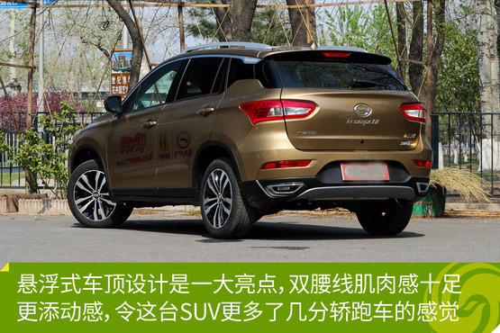 車側的雙腰線設計值得欣賞,肌肉感、力量感讓這臺SUV看上去更加敦實,同時也更多了幾分轎跑車的感覺。而整車最亮點的設計,莫過尾部的懸浮式車頂設計,隱藏在內部的Trumpchi標識也有低調。