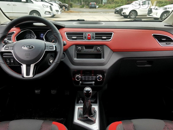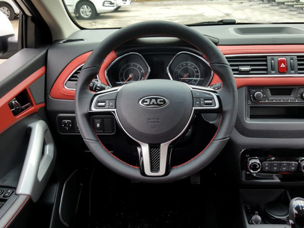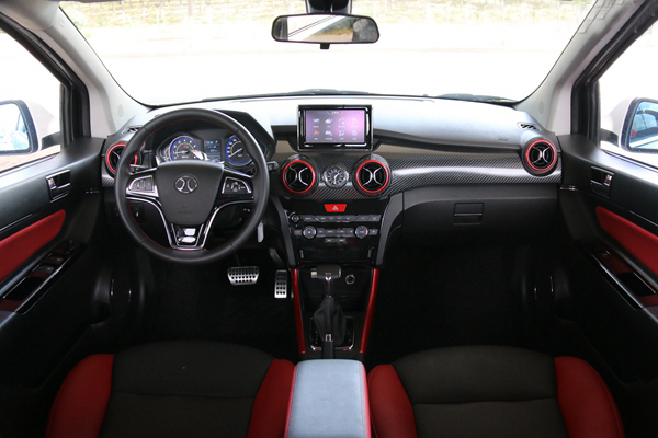內飾顏色采用黑紅色搭配運動感十足。采用三幅式多功能方向盤,紅色線條看上去非常運動,底部鑲嵌了X25的標識。中控臺和門板采用仿碳纖維裝飾。中控面板設計中規中矩,除聲音調節旋鈕外,懸浮式中央顯示屏和出風口的設計源自奔馳A級。