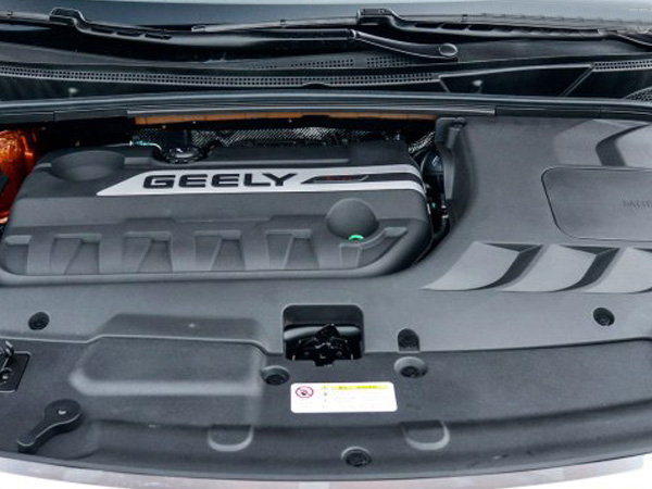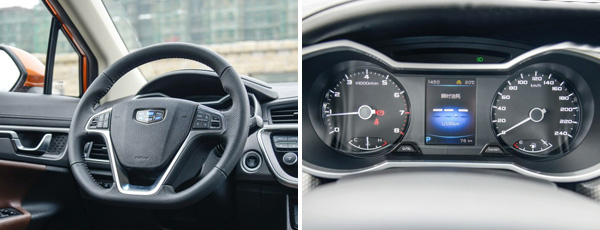 內飾采用了吉利家族最新設計理念,延續了博越的風格,弧線的線條給人非常舒展的視覺效果,雙色搭配的內飾和網格狀中控飾板顯得很有品味。方向盤與目前在售大部分吉利車型的相同,儀表盤采用常見的雙儀表盤配中間彩色液晶顯示屏的設計,夜間點亮后的藍光使其非常有科技感。
