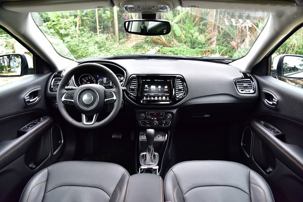 內(nèi)飾大量使用軟性材質(zhì),方向盤(pán)底部還用柔軟的海綿遮擋,此外中控臺(tái)在設(shè)計(jì)時(shí),明顯可以看到為了給主駕駛留有更多的空間,將中央液晶屏向副駕駛側(cè)移動(dòng)了一些。普通版和Trail Hawk版本前排的USB接口位置不同,但易用性差不多,中央扶手內(nèi)設(shè)有USB接口,還為線纜預(yù)留凹槽。8.4英寸液晶屏兩款車(chē)均有配置,采用Uconnect系統(tǒng),支持連接手機(jī),使用預(yù)制的四個(gè)程序,分別是百度地圖、大眾點(diǎn)評(píng)、酷我音樂(lè)以及墨跡天氣。其他方面,1.4T車(chē)型使用ALPINE音響,2.4L車(chē)型則使用BeatsAudio音響。