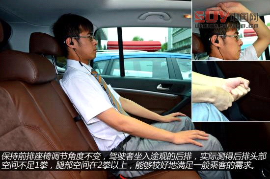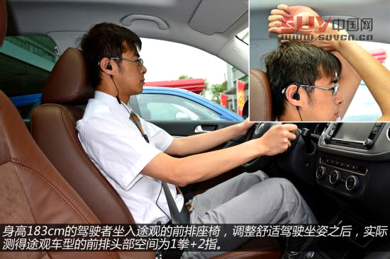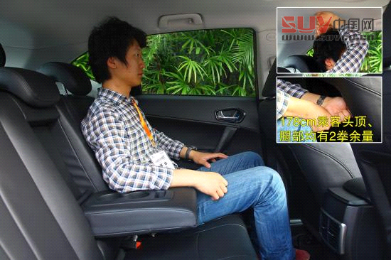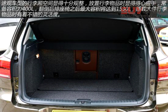 車身尺寸方面,2013款途觀的長寬高為4506*1809*1685mm,軸距為2684mm,與老款車型相比其長度減少19mm。其他方面則基本保持原樣。從空間方面來看,180cm男性前排頭部較為充裕,后排頭部則表現一般,不過后排腿部空間可以達到2拳左右的距離,在緊湊車級別也算比較寬敞的,加上途觀后排座椅可以調節靠背和前后移動,所以長途舒適性和空間靈活性都有很好保障。盡管日常400升行李廂有些不夠寬敞,但放倒后排座椅后,這個空間立馬飆升到1530升,拖運大件物品并不困難。