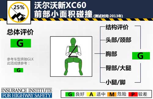 在最為嚴苛的正面25%碰撞測試中,沃爾沃新XC60的發動機艙吸收了大部分能量而潰縮,前排正氣囊、側氣囊以及側氣簾及時彈出保護了駕駛員的頭部,車輛A柱無明顯變形,駕駛艙空間保持良好,駕駛員身體其他部位也得到了充分的保護。小面積碰撞測試中新XC60的各項成績均為良好,奔馳GLK則沒有公布此項測試成績。