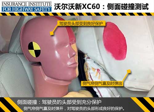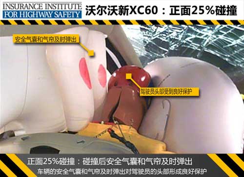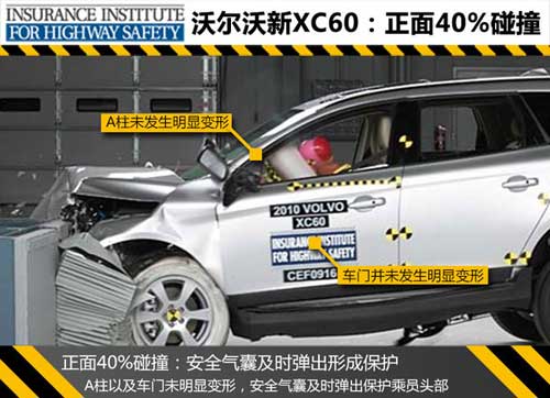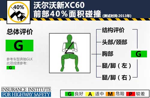 正面40%碰撞測試中,沃爾沃新XC60碰撞時安全氣囊及時彈出保護了駕駛員的頭部,碰撞后A柱無明顯變形,駕駛艙空間基本保持完整,車內人員身軀各部位都得到了充分的保護。新XC60這項測試總成績以及其中各項成績均為良好,而參考車型奔馳GLK在這項測試中駕駛員右側腿和腳部位的得分為“A”,此車型對駕駛員的腿/腳保護應進一步提升。