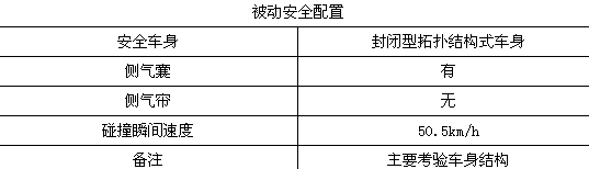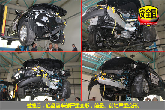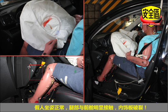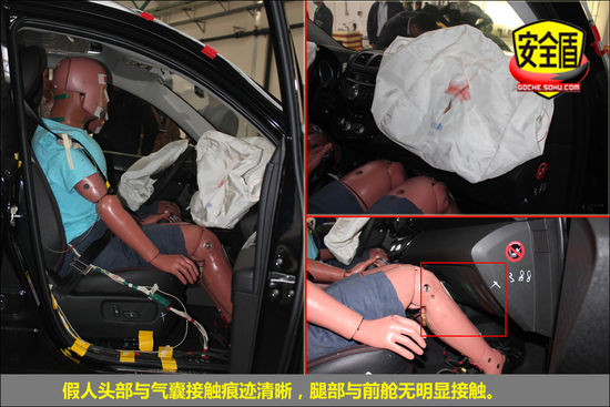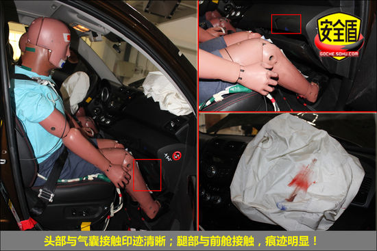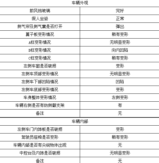 碰撞后,前排雙氣囊正常彈出,駕駛席假人頭部與氣囊觸點清晰;駕駛席假人腿部與前艙明顯接觸;轉向管柱無明顯變形;副駕駛席假人坐姿正常,氣囊觸點印跡清晰,假人腿部與前艙接觸,印跡明顯,安全帶緊扣。