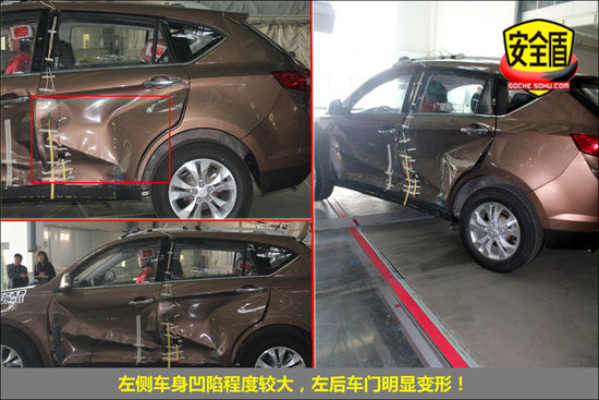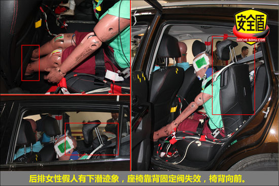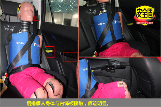 碰撞過程中,后排假人碰撞期間運動幅度較大,向左偏移,身體與車門內飾板接觸,印跡清晰;假人具體的受傷情況還需等待試驗結果。