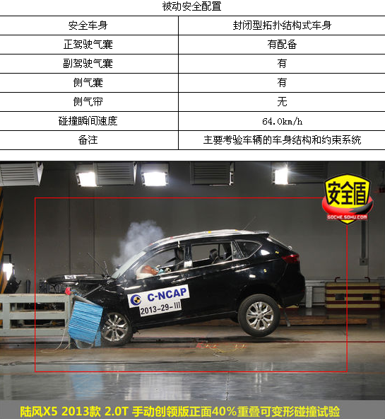 近日,中國汽車技術研究中心碰撞實驗室對江鈴控股有限公司生產的江鈴牌JX6461L型多用途乘用車(陸風X5 2013款 2.0T 手動創領版)完成了“C-NCAP碰撞試驗”。對于工薪階層的消費者來說,國產車也許是滿足他們開上SUV愿望的最佳選擇。其實消費者追求的不只是價廉,更是物美,簡單的說至少在安全性上有保障。陸風X5能不能滿足消費者最基本的需求?讓我們先看看它在碰撞試驗中的表現如何。