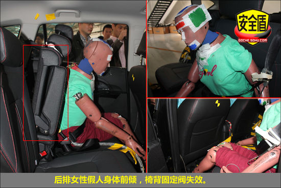 碰撞后,后排椅背固定閥失效,假人前傾,安全值得擔憂,手臂有不規則舉動,安全帶緊扣,具體的受傷情況還需等待試驗數據分析。