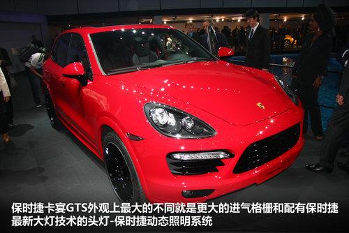 新款 Cayenne GTS 的運動氣質不僅體現在性能上,在外觀上也相當明顯。Cayenne GTS 典型特色是前部的加大冷卻進氣口(與 Cayenne Turbo 相似)和大燈:Cayenne GTS 標配了保時捷最好的照明技術 —保時捷動態照明系統(PDLS)。該系統是氙氣照明系統的強化版,配有集成的動態及靜態彎道燈、具有鄉村公路及高速公路兩種模式的速敏式行車燈控制裝置以及防風防霧照明。此外,Cayenne GTS 大燈的內部鑲邊采用黑色裝飾,LED尾燈也采用了暗色。