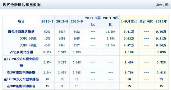 或許大家對現代引進到國內的ix35這款suv車型已經比較熟悉了,但其實現在和ix35一起同步在市場上銷售的還有比它塊頭兒更大的家伙,就是這款全新勝達。從上面的銷售業績表格上看,雖然從去年到現在的數量并不客觀,但在北京的路上也已經能經常見到它的身影。