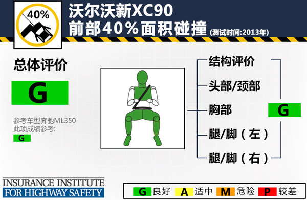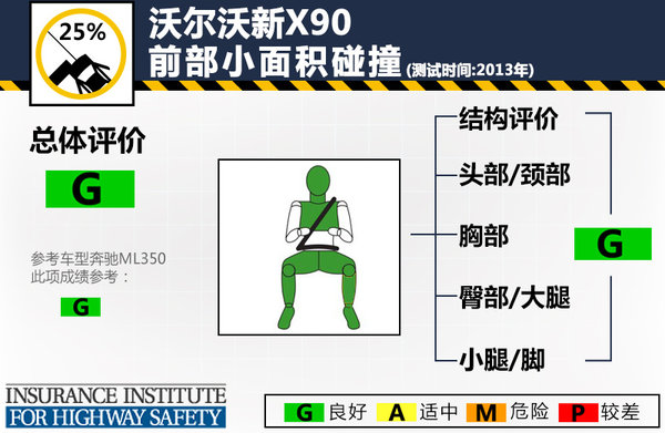 沃爾沃新XC90的最終總體評價為最高級別“G”,從成績上看新車在各項碰撞中均取得了良好的成績。值得一提的是新車不但小面積撞擊測試的總成績為良好,且其中的各項考核成績也均為良好。我們這次選擇的參照車型奔馳ML350總體評價也是最高分,不過雖然各大項測試成績同樣為良好,但小面積測試中駕駛員的左側小腿和腳卻有受到傷害的風險。
