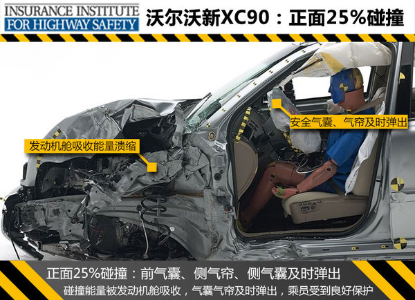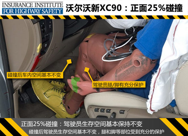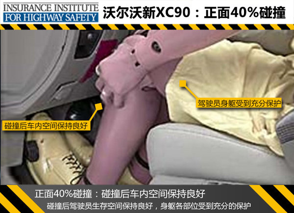 在最為嚴苛的正面25%碰撞測試中,沃爾沃新XC90的發動機艙潰縮吸收了大部分能量,車輛A柱無明顯變形,駕駛艙空間保持良好。前排正氣囊、側氣囊以及側氣簾及時彈出對駕駛員的頭部和身軀其他部位提供了充分的保護。小面積碰撞測試中新XC90的各項成績均為良好,奔馳ML350在測試中駕駛員左側小腿/腳一項得分略低,有受到傷害的風險, 此車對駕駛員的腿/腳保護應進一步提升。