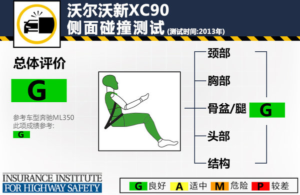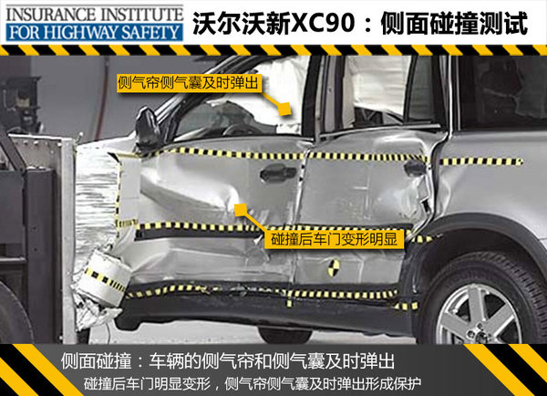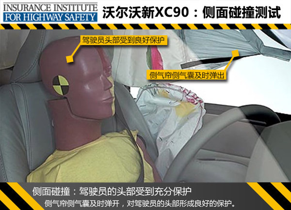 在側面碰撞測試中,沃爾沃新XC90的側安全氣囊和氣簾及時彈出,對駕駛員的頭部形成了良好的保護。雖然碰撞后車門已變形,但車內生存空間保持完好,駕駛員的身軀其他部位也受到充分的保護。新XC90的側撞測試除車身結構項得分略低外,其余各項成績均為良好,奔馳ML350這項測試總成績以及其中各項成績均為良好。