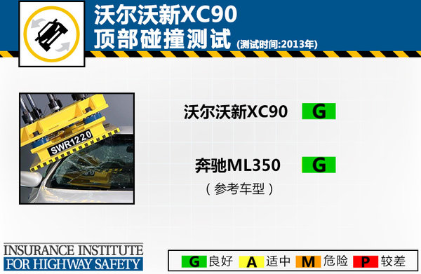 頂部碰撞主要測試車輛發生翻滾時車型結構的變化,成績可反映出側翻時車身結構的安全性,在這項測試中沃爾沃新XC90和奔馳ML350均取得了良好的成績。