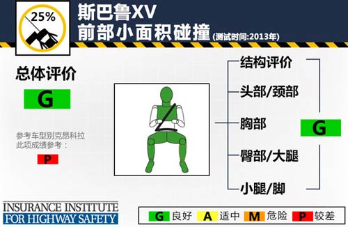 斯巴魯XV的最終總體評價為最高級別,而且此車在各項碰撞中均取得了良好的成績,尤其在正面25%小面積碰撞測試中全部6項考核成績均為良好。反觀我們這次選擇的參照車型別克昂科拉,正面25%碰撞測試成績為最低級別“P”(較差),昂科拉在小面積碰撞中對車內乘員的保護還有待提升。