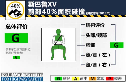 斯巴魯XV的正面40%碰撞測試總成績和各項成績均為良好。別克昂科拉的正面40%碰撞測試各項成績同樣均為良好。