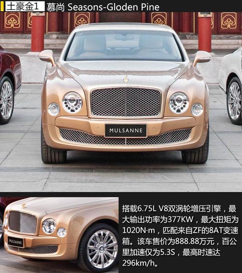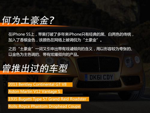 “土豪金”一詞自2013年9月20日蘋果發布手機產品iPhone 5S、iPhone 5C開始,由于機身顏色采用的香檳金色所以被網友調侃為土豪金,從此該詞便風靡整個網絡。不過在汽車領域,土豪金的概念并非首次出現,歷史上曾有多款車型采用了以金色為主色調的車身顏色的車型,包括1935 Bugatti Type 57 Grand Raid Roadster、2013 Bentley Continental GT V8和Aston Martin V12 Vantage S等等的車型。