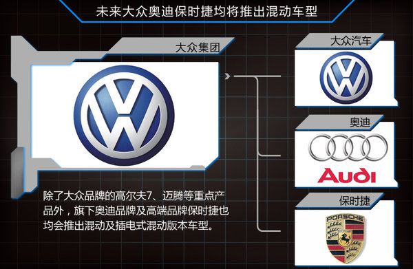 大眾集團旗下現有的混動產品除了大眾途銳外、還包括了奧迪Q5、A6、A8,保時捷卡宴、918、Panamera,及大眾Jetta。未來大眾將混合動力作為技術發展的核心策略,大力推廣多款混動車型。除了高爾夫7、邁騰等重點產品外,旗下奧迪品牌及高端品牌保時捷也均會推出相應的混合動力車型。