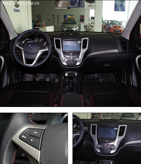 內飾方面:長安CS35采用了黑色內飾配色,中控臺的造型和長安逸動類似,均以突顯年輕氣息為主。另外,長安CS35采用黑色皮革座椅,配以紅色縫線,看上去視覺效果不錯,且在乘坐舒適性方面讓人滿意。