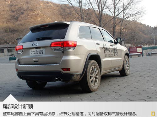 全新大切諾基動感的尾部造型,給人一種熱血沸騰的感覺。在設計方面,新車尾燈與前大燈相同,紅色的LED行車燈環繞在停車指示燈周圍,當前大燈亮起時會自動亮光。此外分割兩側的雙排氣孔,更加彰顯車輛的運動性能。