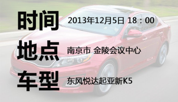 2013年12月5日,東風悅達起亞全新K5將在南京金陵會議中心正式上市。屆時,東風悅達起亞總經理蘇南永、東風悅達起亞副總經理林鐘憲和中國知名男演員吳秀波等將蒞臨現場,共同見證這款中級轎車的上市盛典。起亞全新K5此次在原有2.0L和2.4L發動機的基礎上,新增2.0T發動機,預計售價22萬起。