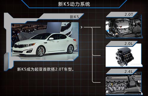 此次起亞K5為了增強在同級車市場中的競爭力,在動力上保留了現款的2.0L和2.4L兩款自然吸氣發動機的基礎上,新增2.0T渦輪增壓引擎,該引擎最大功率可達181kw,峰值扭矩為350Nm,動力表現將更加強勁。
