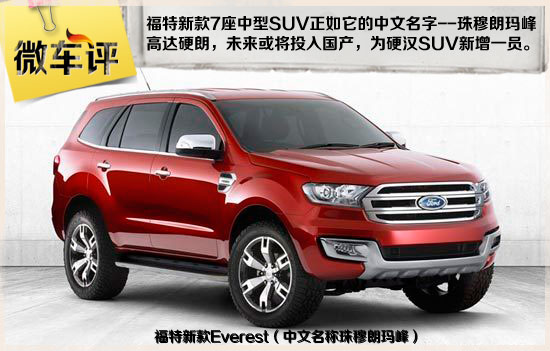 日前福特發(fā)布了新款Everest(中文名稱珠穆朗瑪峰)概念車的官圖。新車定位7座中型SUV,并有望于2014年正式亮相。
