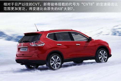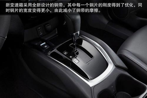 相對于日產以往的CVT,新奇駿將搭載的代號為“CVT8”的變速箱齒比范圍更加寬泛,將變速比由原先的6擴大到7,方法是減小主動輪軸的直徑,這樣主動輪就可以有更大的變化范圍。新變速箱采用全新設計的鋼帶,其中每一個鋼片的剛度得到了優化,同時鋼片的寬度變得更小,由此減小了鋼帶的摩擦,從而提升了變速機構的工作效率。