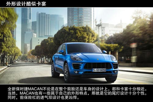 Macan依然會保留保時捷品牌的風格特征,比如與Q5不同的發動機和懸架系統調校;而外觀和內飾風格,更是有著自己的DNA。新車外觀和內飾都將與卡宴車型一脈相承,實際上Macan的前臉本來就是與卡宴大同小異的設計,進氣格柵居中的位置能夠看到自適應巡航系統的雷達探頭,不同的是Macan的尾部比卡宴更緊湊,側面的尾部舷窗尺寸也更小。