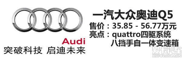2013款一汽奧迪Q5在2013年的上海車展上市,自2009年在國內推出至今一直占有很高的市場銷售額,在同級別車型中銷量一直處于領先地位。奧迪Q5的外觀一直保持著飽滿溫潤的設計特征,車前臉采用六邊形設計的一體式進氣格柵,頭燈采用奧迪家族最新的設計,辨識度很高。