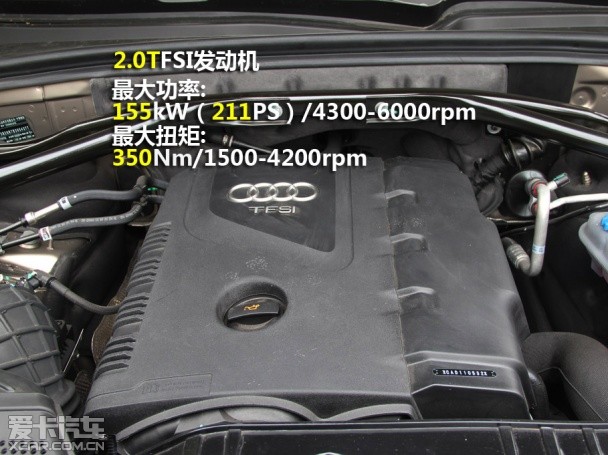 2013款Q5所搭載2.0TFSI缸內直噴汽油發動機與奧迪A4L車型上的發動機完全相同。它可以發出155kW的最大功率,并且350N·m的峰值扭矩可以從1500rpm/min轉速下爆發直至4200pmr/min,在官方資料中奧迪Q5 2.0T可在8.6s內完成0--100 km/h的加速。這對于一個城市SUV來說已經相當優秀了。