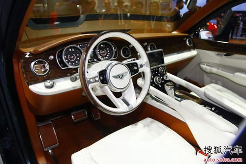 賓利SUV采用了非常考究豪華的內飾,白色與棕色的搭配凸顯尊貴典雅。再加上大量的鍍鉻和金屬裝飾件,提升了內飾的質感和檔次。中控設計采用了大量的圓形設計元素,與前臉的設計相呼應。并且采用了大面積的天窗,后備箱還巧妙地設計了一個微型的吧臺。