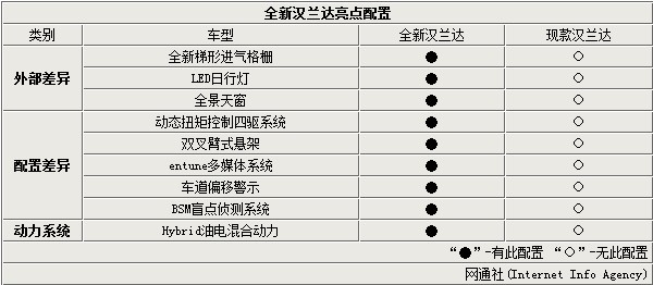 新一代漢蘭達相對于現款車型可謂發生了翻天覆地的變化,不僅外觀設計讓人看了耳目一新,而且新增的動態扭矩控制四驅系統、BSM盲點偵測系統、車道偏移警示、entune多媒體系統以及全景天窗等諸多配置也足以媲美高級別的豪華SUV車型。