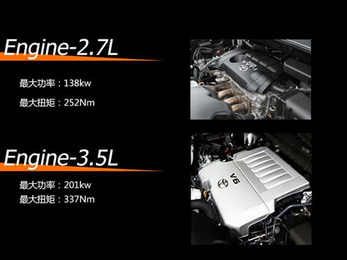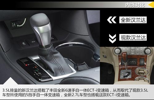雖然全新漢蘭達的引擎還是時下的2.7L 4缸汽油發動和3.5L V6汽油發動機,但匹配的變速箱卻是豐田全新的電子控制6速手自一體ECT-i變速箱,與現款車型普通6AT和5AT相比,ECT-i變速箱有著更好的加速性和燃油經濟性。