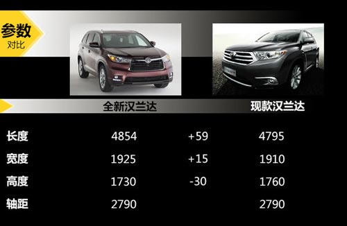 全新漢蘭達在車身尺寸上進行了不小的調整,新車的長寬高分別為4854mm*1925mm*1730mm,和現款車相比,長度增加了59mm,寬度增加了15mm,雖然長和寬同時增加尺寸,但新車的軸距卻沒有相應加大,仍為現在的2790mm。此外,新車的高度降低了30mm。