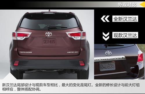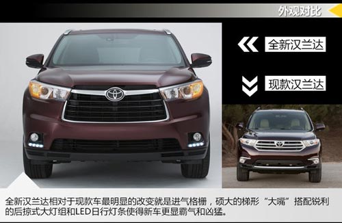 豐田全新一代漢蘭達更加粗獷的造型讓人眼前一亮,寬大的車身、大尺寸進氣格柵,突出的車身線條,單是這些外觀的大幅改變就顛覆了現款漢蘭達含蓄而柔和的形象。新車的外觀更加靠近普拉多的胞生兄弟--豐田4Runner和豐田的紅杉sequoia這兩款在北美市場銷售的大尺寸SUV車型。