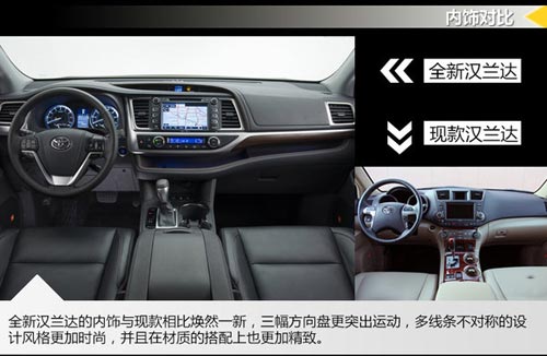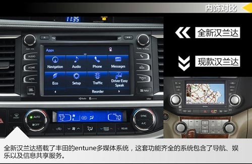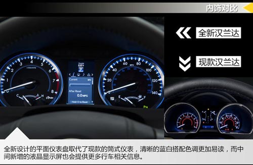 全新漢蘭達的內飾設計也可以用煥然一新來形容,現款的四幅方向盤被更加運動的三幅方向盤所代替,雙炮筒型的儀表也被更加簡潔醒目的藍白色調平面表盤取代,中間新增的液晶顯示屏能夠提供給駕駛者多項行車數據。豐田的entune多媒體系統應用在全新漢蘭達上,這套系統整合了導航、天氣、衛星廣播、通信、藍牙、娛樂等多種功能。