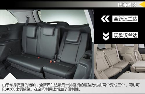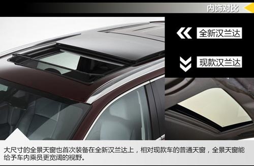 車身尺寸的增加使得全新漢蘭達有了8座版本,同時第3排座椅頭枕的設計也更加符合人體工程學。現款漢蘭達的2、3排座椅只能50:50的折疊放倒,而新款車型的2、3排座椅均可40:60放倒,在空間利用上增加了便利性。全景天窗的配備,也使車內乘員擁有更加寬闊的視野范圍。