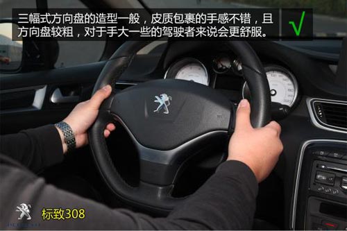 標致308在內飾用料方面大面積的使用了軟質材料包裹,手感上佳,方向盤的握感也較為舒適,不過多媒體操作按鍵的設計較為小巧,操作起來不是很方便。但整體看來還是不錯的。