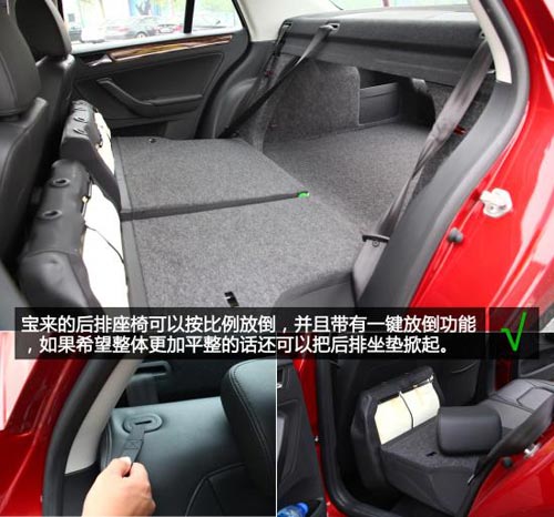 寶來的前排儲物空間較多,完全滿足日常使用需求,但后排的門板內側儲物格設計有些稍小,大一點的水瓶就放不下了。后排座椅一鍵放倒功能較為實用,并且其掀起坐墊,放倒椅背后的后備箱整體較為平整,即使需要放一些大件物品時也是夠用的。