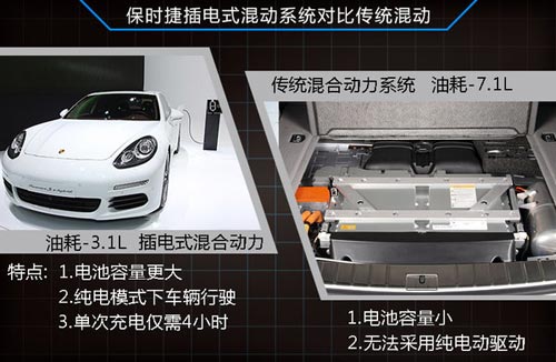 目前在保時捷的產品線中,Panamera已率先搭載插電式混動系統。在動力提升的同時,車輛油耗僅為3L左右。此前保時捷旗下所推出的混合動力車型中,僅搭載了最大功率為9千瓦的電動機,主要作用是車輛起步時起到輔助與制動能量回收工作。據了解,插電式混動系統將采用一臺75千瓦的電動機,與這套電動機所匹配的是保時捷3.0升V6機械增壓缸內直噴發動機,其最大功率為244千瓦。兩者相加,發動機的綜合功率可達到305千瓦。