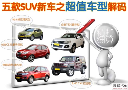 近期上市的低價SUV中,可謂是臥虎藏龍,盡管價位都在10萬元附近徘徊,但都有自己的看家本領——鈴木鋒馭的高配低價來襲;10萬內的中型SUV-眾泰T600;硬派SUV小牧馬人BJ40;2014升級版長安CS35;還有奇瑞的明星車型-瑞虎5。現在我們就為這五款新上市的SUV車型中進行詳加解讀,為您尋找出其中又便宜又超值的主力車型,精打細算讓您不花冤枉錢,何不一同來瞧瞧?