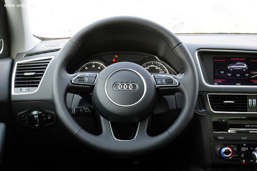 中控臺最左側依舊是大燈開關旋鈕和空調出風口,但不知為何,空調出風口的鍍鉻裝飾并沒有在大燈調節旋鈕上出現。四輻多功能真皮方向盤,是奧迪一貫的設計風格,各個按鍵阻尼調節適中。如果是一位MM開車那么方向盤可能就有點粗了。