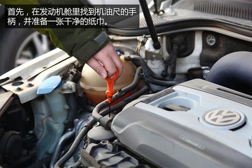 1.在發動機艙里找到機油尺的手柄,準備一張干凈的紙巾。