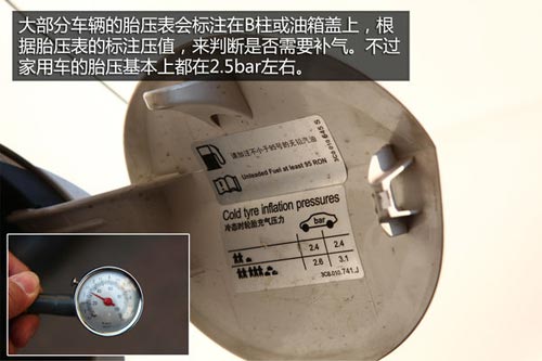 2.由于車輛不同,胎壓也基本不同,大部分車輛的胎壓表會標注在B柱或油箱蓋上,根據胎壓表的標注壓值,來判斷是否需要補氣。
