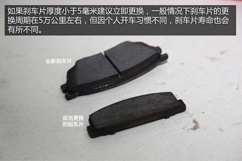 1.我們可以自行檢查一下剎車片的厚度,如果剎車片厚度小于5毫米建議立即更換(一般情況下剎車片的更換周期在5萬公里左右,但因個人開車習慣不同,剎車片壽命也會有所不同)。