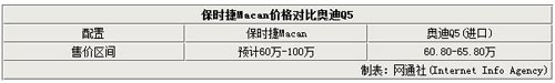 縱觀保時捷品牌的產品線,旗下SUV車型只有一款卡宴。對于保時捷將推出的中型SUV,其將采用奧迪Q5的平臺打造。據了解,目前Macan車型的年產能為5萬輛,在今年7月有望進入中國市場。根據該車目前在臺灣地區的售價計算,預計Macan未來在華上市計售價約在60-100萬之間。相比之下,進口奧迪Q5的價格在60.8-65.8萬元之間。兩者在對比后,我們可以看出進口的奧迪Q5在價格上具有一定的優勢。
