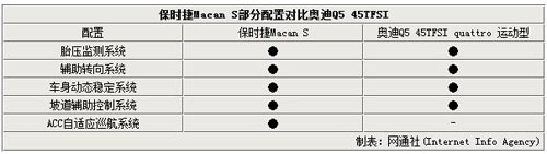 在車輛的配置方面,保時捷Macan車型標配胎壓監測系統、輔助轉向系統、保時捷車身動態穩定系統、坡道輔助控制系統等,此外車輛還使用了ACC自適應巡航系統。相比而言,進口奧迪Q5并未自適應巡航系統,只是作為車輛的選配。單從目前公布的信息來看,車輛在配置上兩者相差并不明顯。